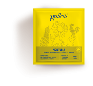 Montubia Tisana de frutos amarillos, caléndula y jengibre Ingredientes: Mango, plátano, piña, maracuyá, uvilla, cúrcuma, caléndula y jengibre Cada caja contiene 10 sobres de frutas y flores sueltas. Producido por mujeres campesinas ecuatorianas.